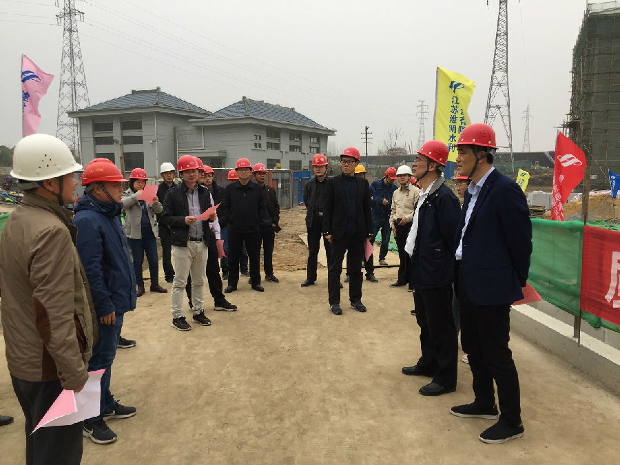2019年3月21日,水利部建安中心總工程師熊平、建設司基建處副處長陳何鎧一行在安徽省水利廳工程建設處處長周建春、蕪湖市水務局局長王津華、水務局副局長王峰、蕪湖市鏡湖區農水局孫科長等人陪同下,視察我公司承建的袁澤橋泵站建筑安裝工程。